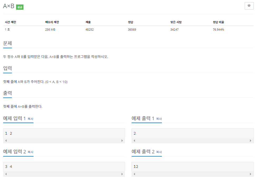 2개의 정수를 입력받아 A*B 연산의 결과를 출력해주면 되는 간단한 문제입니다.
