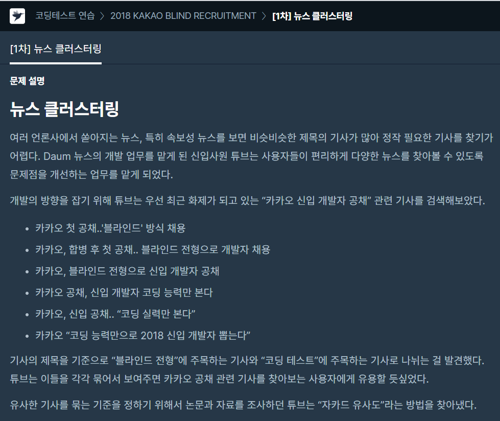 뉴스 클러스터링 여러 언론사에서 쏟아지는 뉴스, 특히 속보성 뉴스를 보면 비슷비슷한 제목의 기사가 많아 정작 필요한 기사를 찾기가 어렵다. Daum 뉴스의 개발 업무를 맡게 된 신입사원 튜브는 사용자들이 편리하게 다양한 뉴스를 찾아볼 수 있도록 문제점을 개선하는 업무를 맡게 되었다. 개발의 방향을 잡기 위해 튜브는 우선 최근 화제가 되고 있는 카카오 신입 개발자 공채 관련 기사를 검색해보았다. 카카오 첫 공채..'블라인드' 방식 채용 카카오, 합병 후 첫