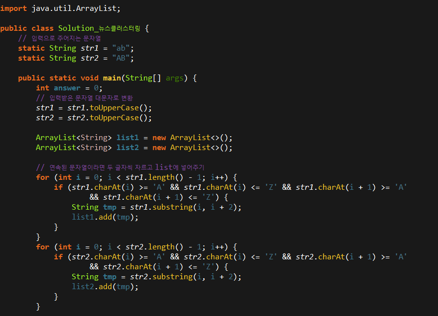 1. 먼저 str1과 str2를 모두 toUpperCase()를 사용하여 대문자로 변환해줍니다.