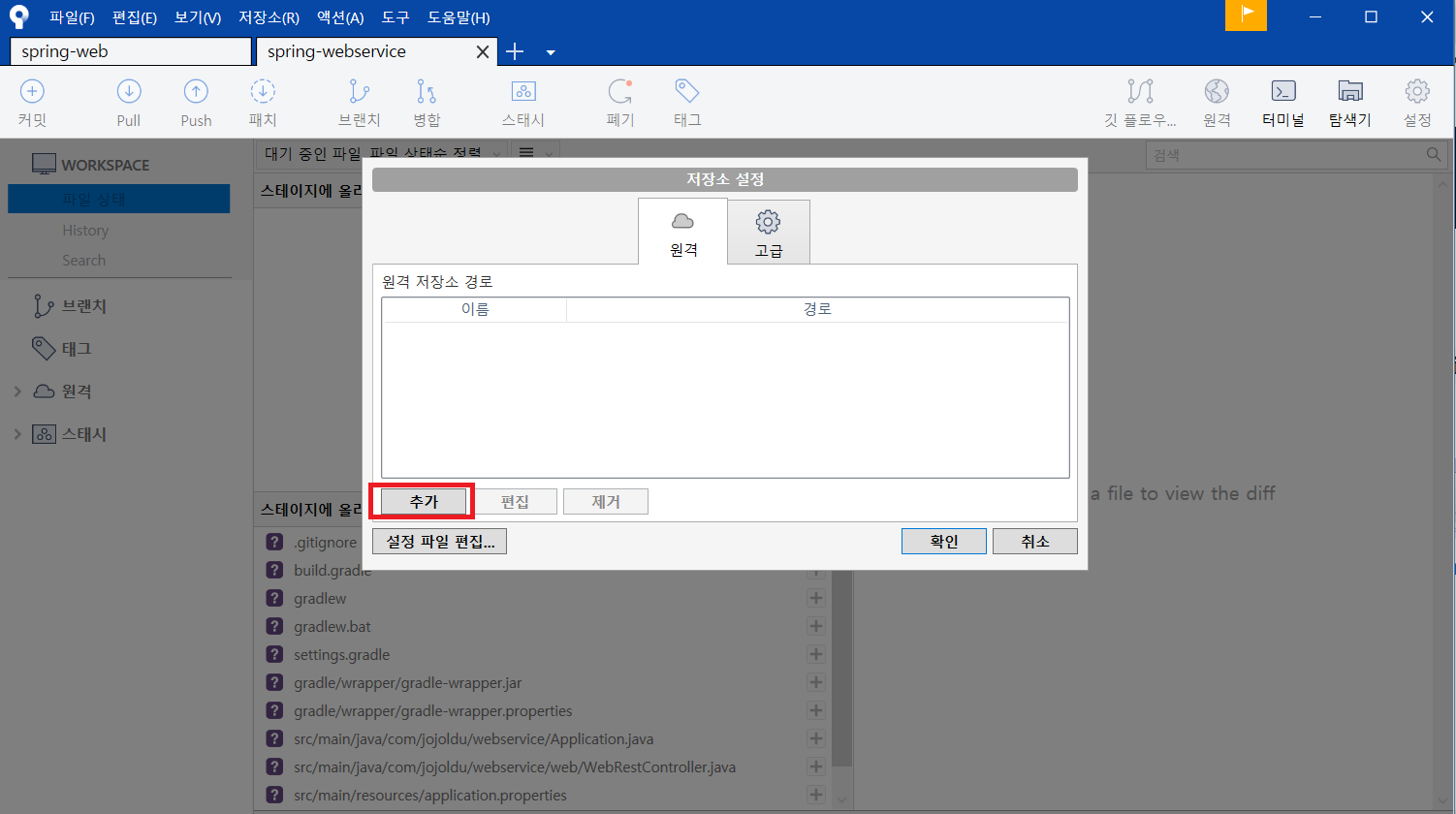 저장소 > 저장소 설정 > 추가 버튼을 눌러주세요