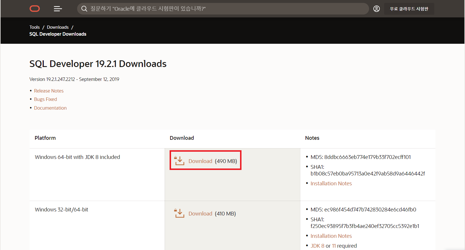 오라클 설치 페이지로 이동하기 ( https://www.oracle.com/kr/tools/downloads/sqldev-v192-downloads.html )