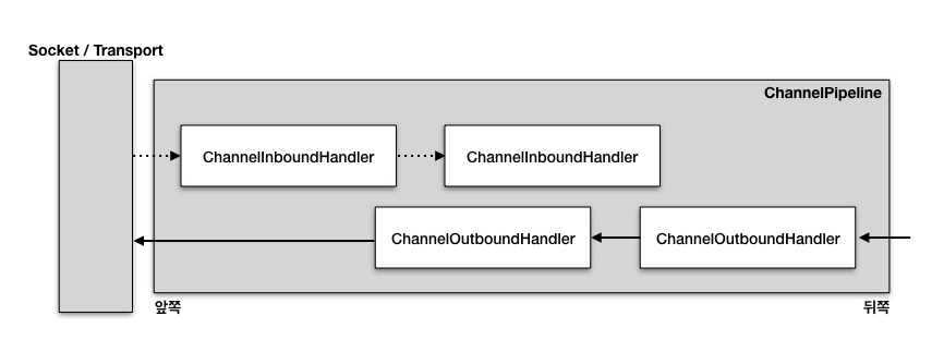ChannelPipeLine: ChannelHandler 체인을 위한 컨테이너 역할. 채널이 생성되면 ChanelPipeline은 자동으로 할당된다.