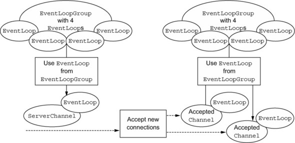 두 번째 집합은 서버가 수락한 연결마다 하나씩 들어오는 클라이언트 연결을 처리하기 위해 생성된 모든 Channel