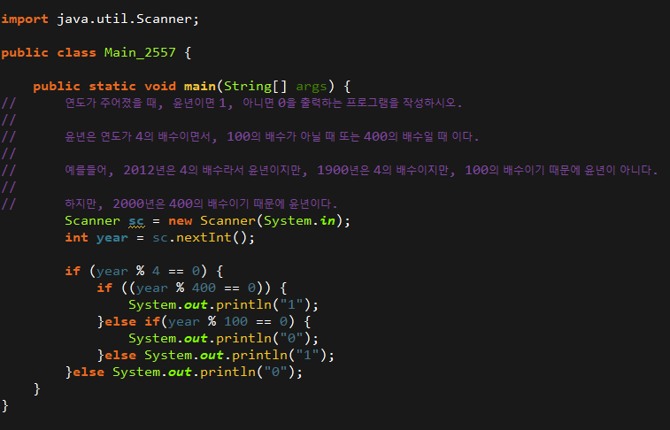 주의하실 점은 400의 배수인 연도를 먼저 찾고 100의 배수일 때를 나중에 찾아 제외시켜주어야 합니다.