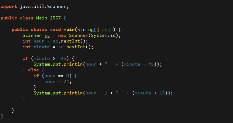 문제 상근이는 매일 아침 알람을 듣고 일어난다. 알람을 듣고 바로 일어나면 다행이겠지만, 항상 조금만 더 자려는 마음 때문에 매일 학교를 지각하고 있다. 상근이는 모든 방법을 동원해보았지만, 조금만 더 자려는 마음은 그 어떤 것도 없앨 수가 없었다. 이런 상근이를 불쌍하게 보던, 창영이는 자신이 사용하는 방법을 추천해 주었다. 바로 "45분 일찍 알람 맞추기"이다. 이 방법은 단순하다. 원래 맞춰져있는 알람을 45분 앞서는 시간으로 바꾸는 것이다. 어차피