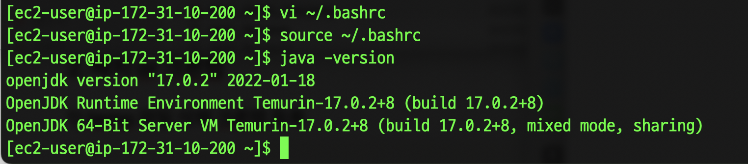 설정 후 java -version 명령으로 확인해보면 아래와 같이 JDK-17 버전이 설정된 것을 확인할 수 있습니다.