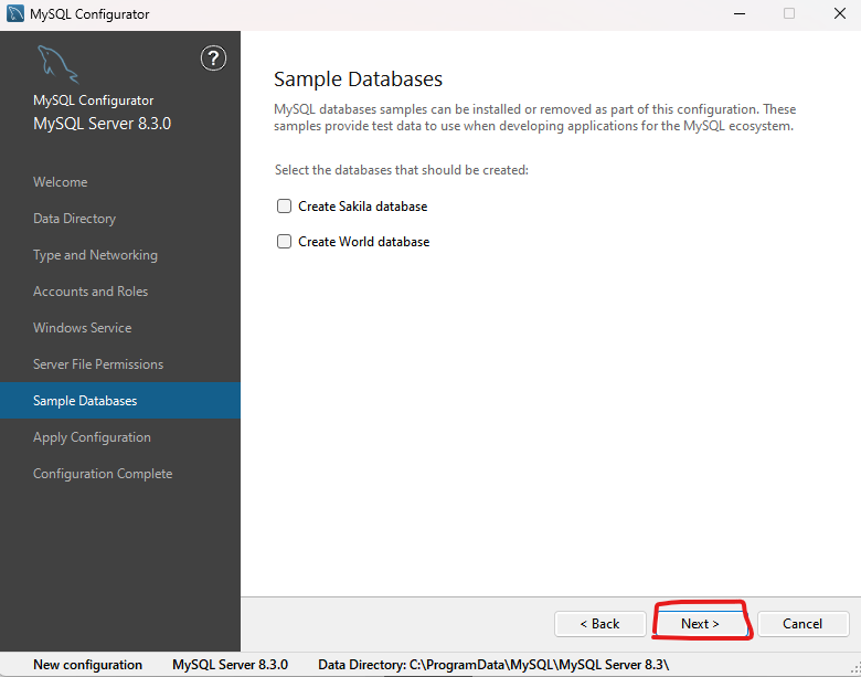 샘플 데이터베이스는 필요 없으므로 Next 선택해주었습니다.