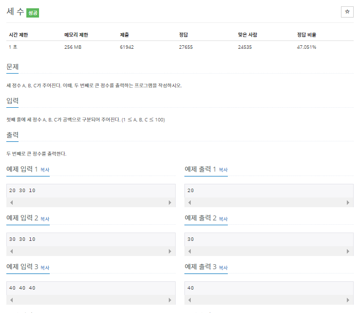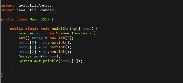 문제에서 세 수 중에서 두 번째로 큰 수를 출력해야 하기 때문에