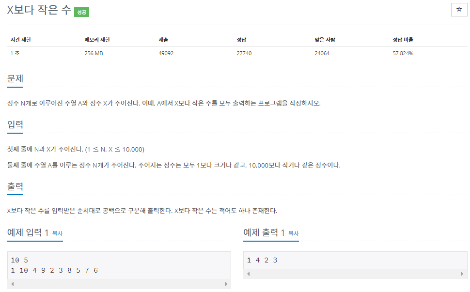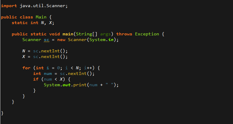 첫째 줄에 N과 X가 주어진다. (1 ≤ N, X ≤ 10,000) 둘째 줄에 수열 A를 이루는 정수 N개가 주어진다. 주어지는 정수는 모두 1보다 크거나 같고, 10,000보다 작거나 같은 정수이다.