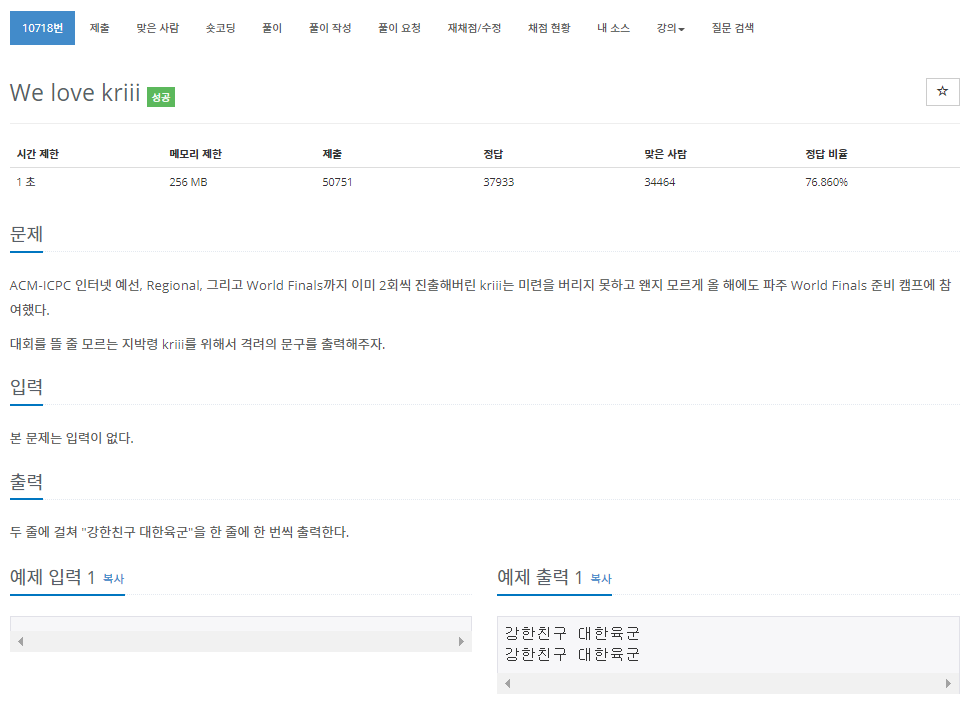 주어진 예제 출력을 보고 "강한친구 대한육군"을 두 번 출력해주면 되는 문제입니다.