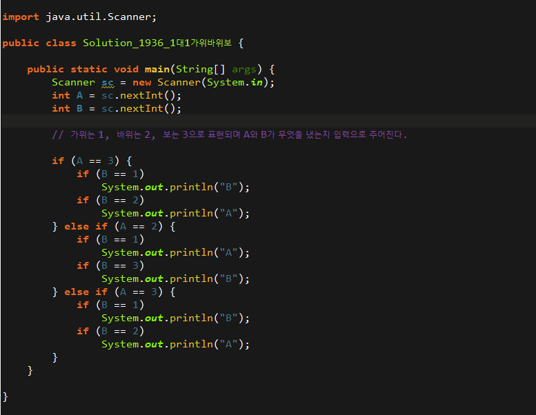 A와 B가 무엇을 냈는지 입력으로 주어진다.