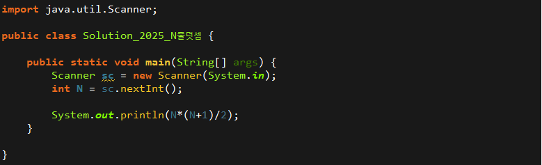 자연수 N을 입력받아 ( N * ( N + 1 ) / 2 ) 연산을 출력하여 정답을 찾았습니다.