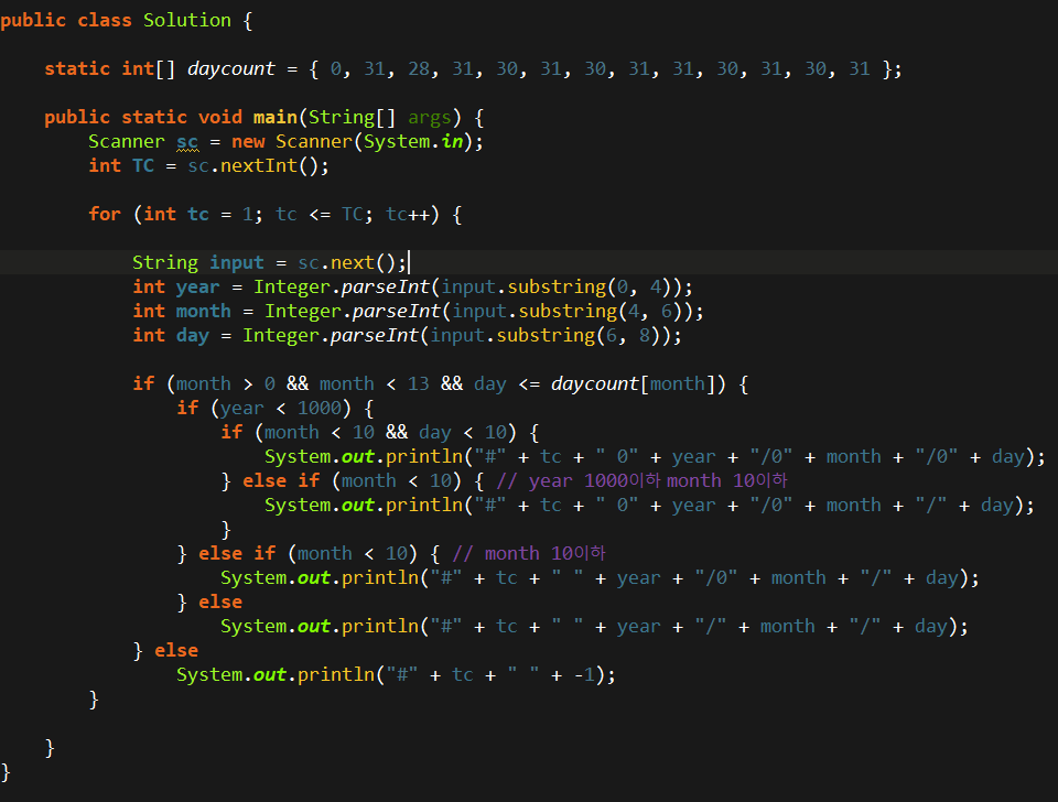 연도가 3자리인 경우, 월이 1자리인 경우에 대해 각각 if문으로 처리해주었습니다.