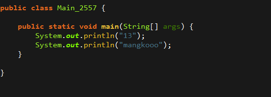 문제 자신이 온라인 저지에서 맞은 문제의 개수와 아이디를 그대로 출력하는 프로그램을 작성하시오. 입력 이 문제는 입력이 없다. 출력 첫 줄에 자신이 맞은 문제의 수, 둘째 줄에 아이디를 출력한다. 예제 입력 1 복사 예제 출력 1 복사 123 Your_ICPC_Team_Name...