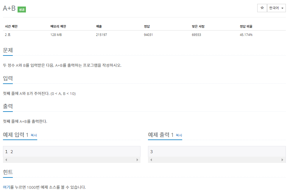 문제 두 정수 A와 B를 입력받은 다음, A+B를 출력하는 프로그램을 작성하시오. 입력 첫째 줄에 A와 B가 주어진다. (0 < A, B < 10) 출력 첫째 줄에 A+B를 출력한다. 예제 입력 1 복사 1 2 예제 출력 1 복사 3 힌트 여기를 누르면 1000번 예제 소스를 볼 수 있습니다....