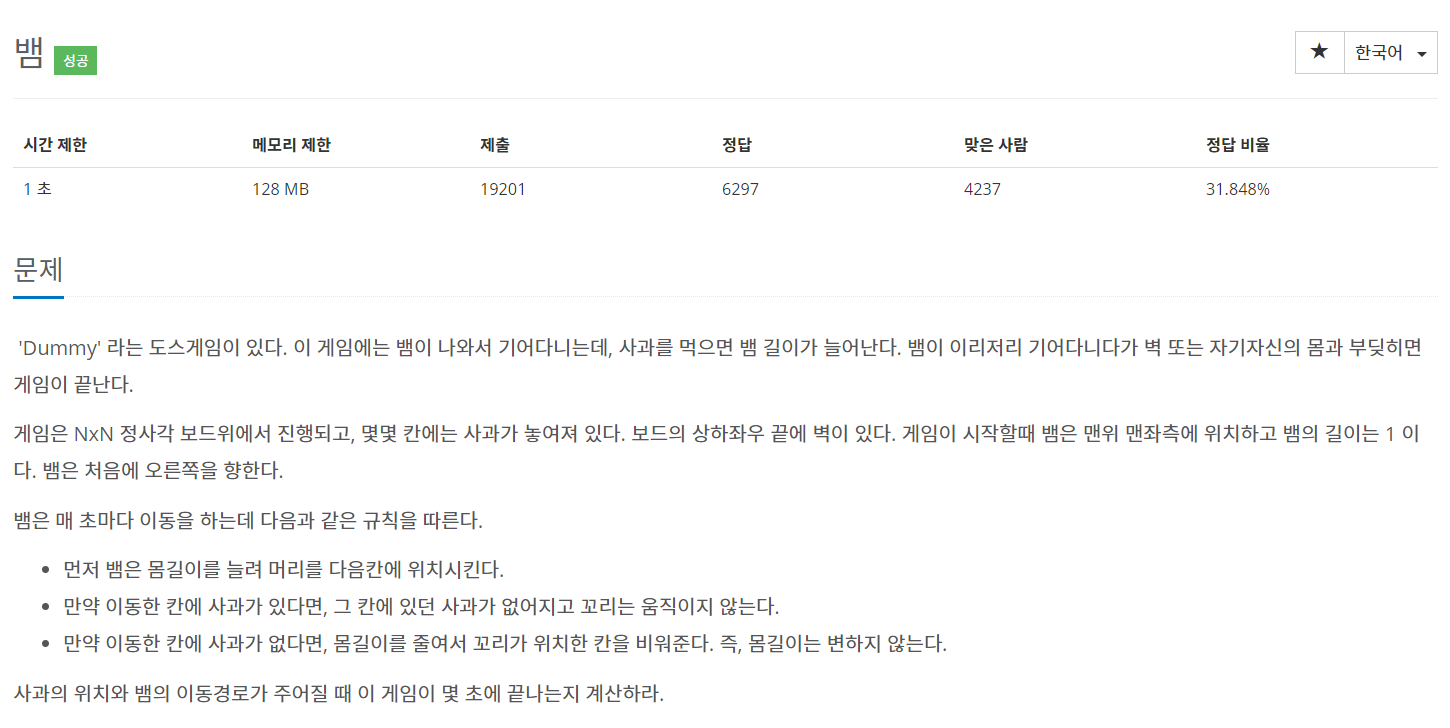문제 'Dummy' 라는 도스게임이 있다. 이 게임에는 뱀이 나와서 기어다니는데, 사과를 먹으면 뱀 길이가 늘어난다. 뱀이 이리저리 기어다니다가 벽 또는 자기자신의 몸과 부딪히면 게임이 끝난다. 게임은 NxN 정사각 보드위에서 진행되고, 몇몇 칸에는 사과가 놓여져 있다. 보드의 상하좌우 끝에 벽이 있다. 게임이 시작할때 뱀은 맨위 맨좌측에 위치하고 뱀의 길이는 1 이다. 뱀은 처음에 오른쪽을 향한다. 뱀은 매 초마다 이동을 하는데 다음과 같은 규칙을 따