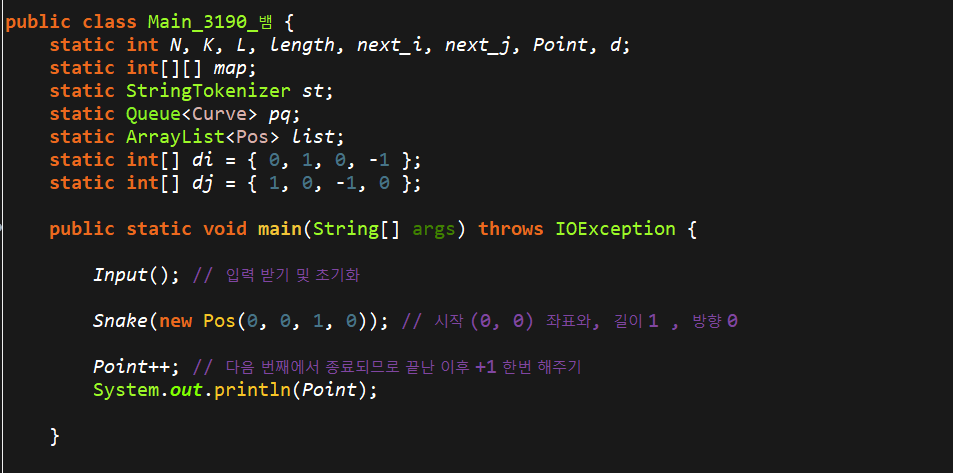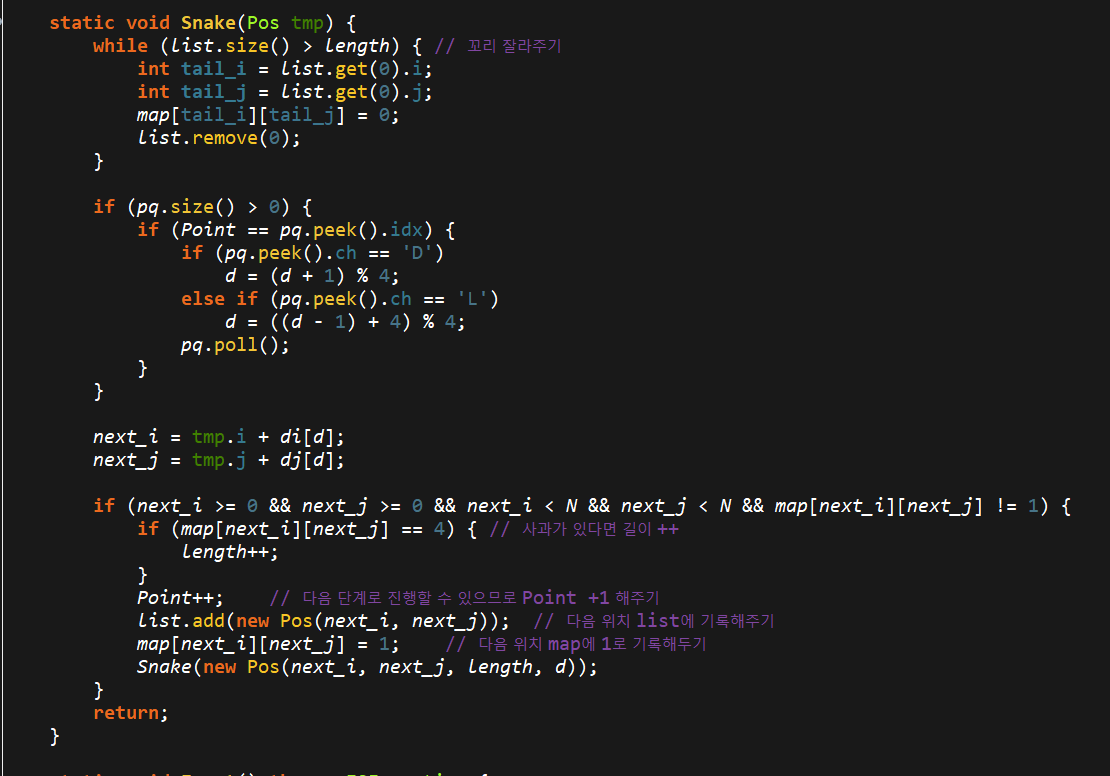 뱀의 진행 순서를 잘 생각해서 풀이를 진행한다면 코드는 어렵지 않게 작성할 수 있는 문제인 것 같습니다.