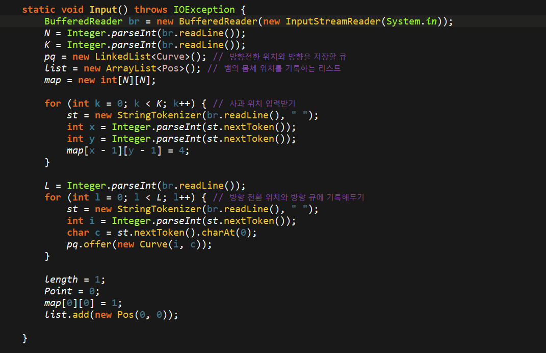 Input( ) 에서는 사과의 위치를 입력받아 4 로 저장해주었습니다.