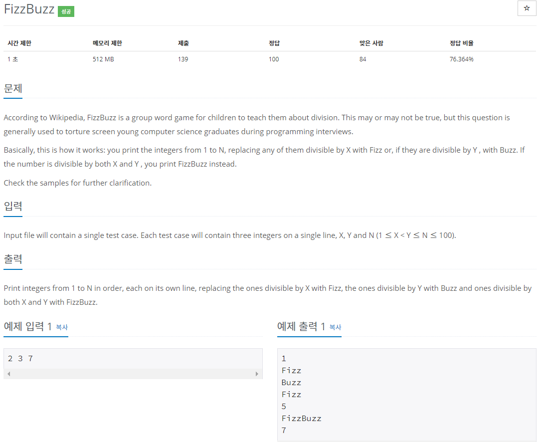X와 Y로 모두 나누어 떨어질 경우에는 "FizzBuzz"를 출력해주면 되는 문제입니다.