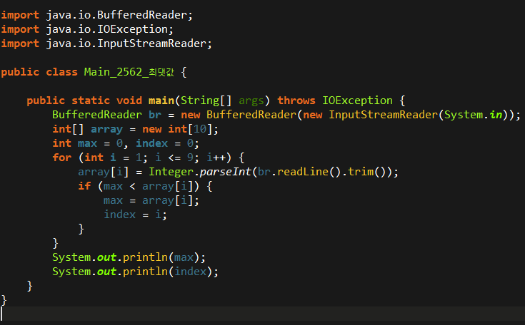 max변수에 담아주었고 그때의 i값을 index에 저장해두었습니다.
