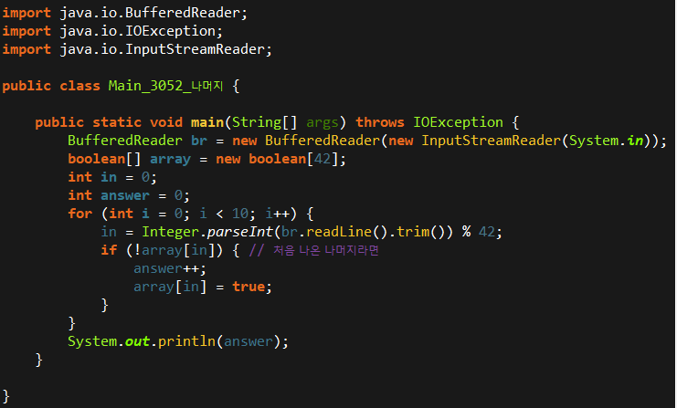 나머지는 0부터 41까지가 가능하므로 boolean형 배열 42개짜리를 만들어주었습니다.