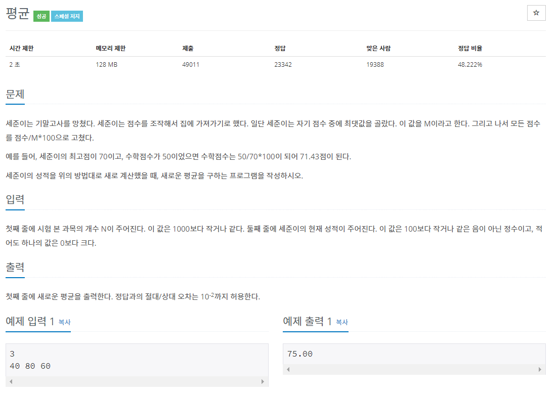 첫째 줄에 시험 본 과목의 개수 N이 주어진다. 이 값은 1000보다 작거나 같다. 둘째 줄에 세준이의 현재 성적이 주어진다. 이 값은 100보다 작거나 같은 음이 아닌 정수이고, 적어도 하나의 값은 0보다 크다.