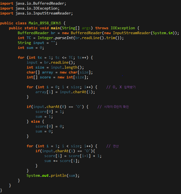 1. sum 변수는 가장 첫 문자가 O일 경우 1점, X일 경우 0점에서 시작합니다.