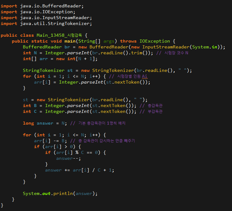 이는 2번의 과정 answer += arr[i] / C + 1 에서 +1을 빼주는 것입니다.