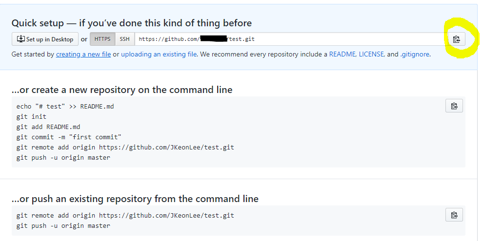 "git remote add origin [복사한 내용]" 을 입력해줍니다.