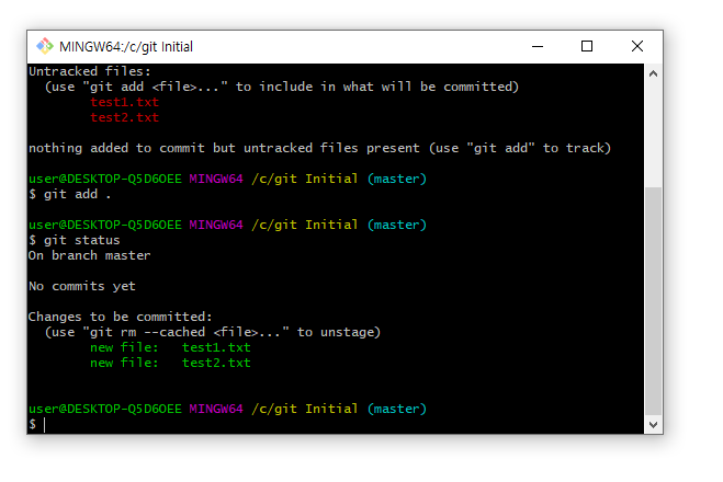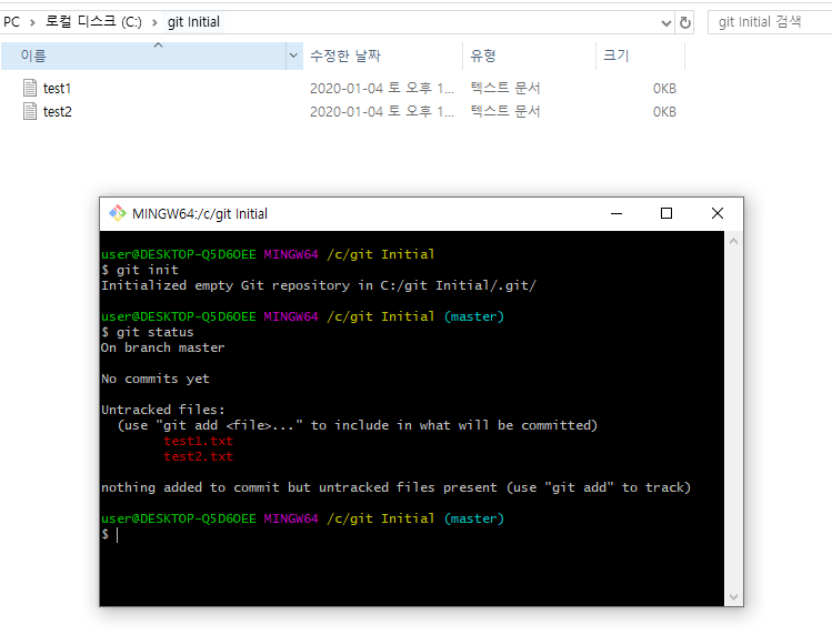 폴더에 확인을 위해서 test1.txt 와 test2.txt 두 개의 텍스트 파일을 만들어준 뒤 git status를 입력했더니