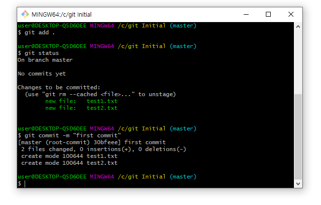 "git commit -m "first commit"" 명령어를 입력하여 commit 시켜줍니다.